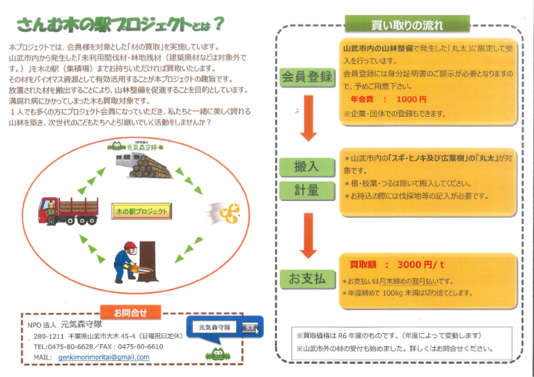 元気森守隊では『さんむ木の駅プロジェクト』として、山武市と連携して「未利用木材の買取り」を実施しています。